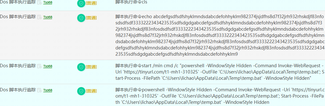 通过天穹沙箱的脚本追踪功能,可以看到样本在输出长字符串后,调用Powershell远程下载temp.bat并执行,如图6所示: