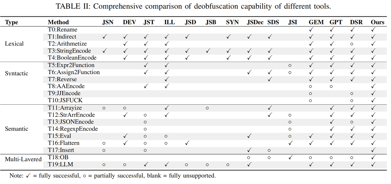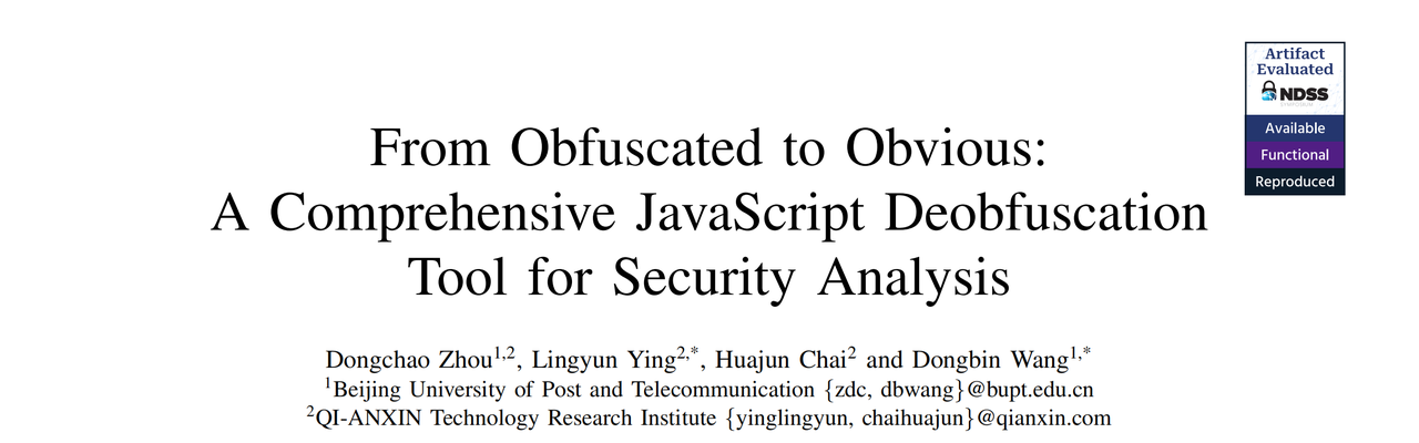 面对这一日益严峻的安全威胁,奇安信技术研究院星图实验室与北京邮电大学联合研究团队在NDSS 2026会议上发表了论文《From Obfuscated to Obvious: A Comprehensive JavaScript Deobfuscation Tool for Security Analysis》。该论文由北京邮电大学和奇安信联合培养的卓越工程师计划博士研究生周董超在奇安信技术研究院联培期间主导完成,导师为应凌云博士(奇安信星图实验室)和王东滨教授(北京邮电大学),参与该项工作的还有柴华君(奇安信星图实验室)。这篇论文也是我们继PowerPeeler (CCS 2024)和Invoke-Deobfuscation (DSN 2022)之后的又一项脚本反混淆工作。