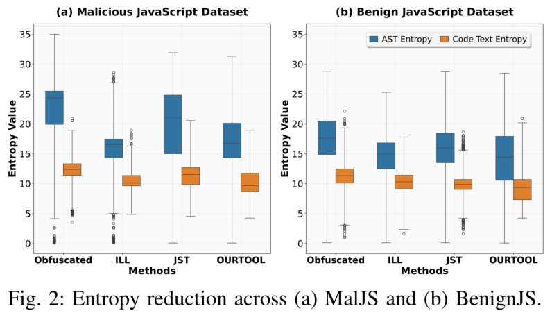 此外,研究团队还采用熵值分析来量化代码的随机性和混乱程度。熵值越低,代码的结构越清晰、可读性越强。大规模评估显示,JSimplifier在全部44,421个样本上实现了显著的熵值降低(如图2)——无论是AST结构熵(衡量代码语法树的复杂度)还是代码文本熵(衡量文本层面的混乱度)均达到最低中位值,充分证明了工具在真实场景中的有效性。