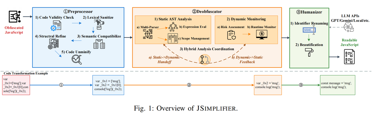针对以上挑战,我们提出了JSIMPLIFIER,一款集代码预处理、静态抽象语法树分析、动态执行跟踪和大语言模型(LLM)智能变量重命名与代码美化于一体的综合性反混淆工具。JSIMPLIFIER采用三阶段流水线架构,每个阶段专门解决一类核心问题,形成了从”输入修复”到”逻辑还原”再到”可读性提升”的完整处理链条。