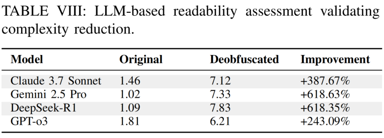 为验证代码可读性提升,研究团队采用了多个先进LLM模型(Claude 3.7 Sonnet、Gemini 2.5 Pro、DeepSeek-R1、GPT-o3)进行独立评估。这些模型对代码可读性进行0-10分的打分,其中0分代表完全不可读,10分代表极易理解。评估结果如下表所示,JSimplifier实现了平均466.94%的可读性提升,将难以理解的混淆代码(评分1.02-1.81,接近完全不可读)转化为适合安全分析的清晰代码(评分6.21-7.83,达到良好可读性水平)。